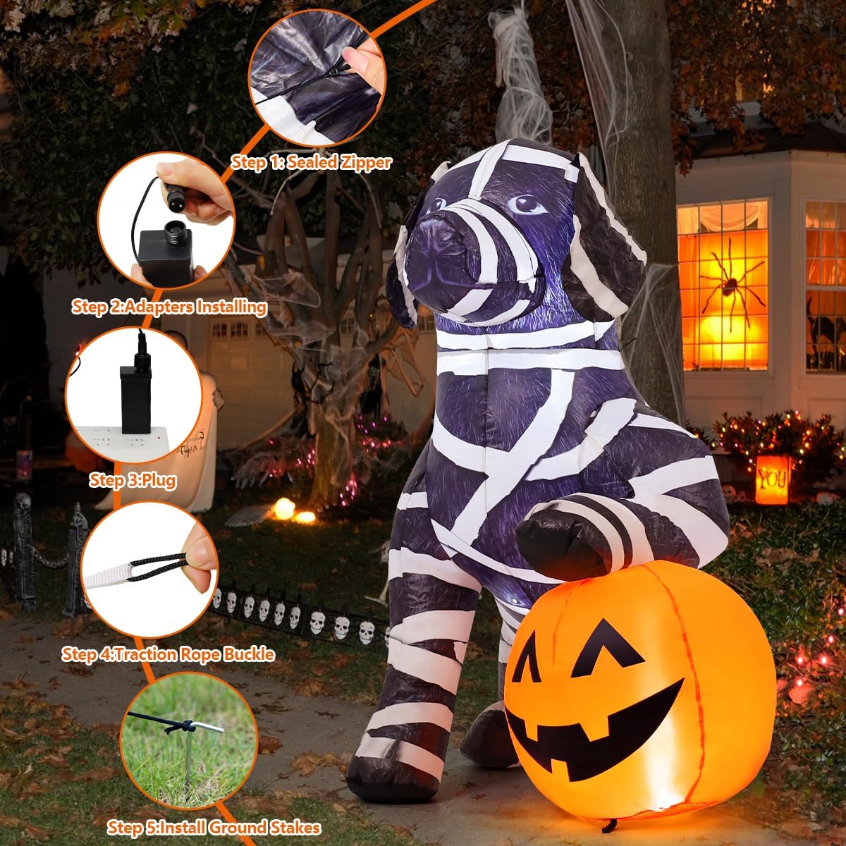 Anchoring and Stability under Duress: Stability is crucial for any outdoor inflatable. The COMIN Labrador Mummy Dog comes equipped with two plastic ground stakes and two tether ropes. The placement of the tether loops on the inflatable (at the base and mid-body) allowed for effective triangulation, providing excellent resistance against moderate winds up to 15-20 mph. Even during gusts, the inflatable remained firmly anchored, exhibiting only a gentle sway rather than listing or toppling. The internal sandbag ballast also contributed significantly to its foundational stability, preventing it from lifting off the ground easily. This comprehensive anchoring system inspires confidence, ensuring your display remains upright and presentable through typical autumn weather.