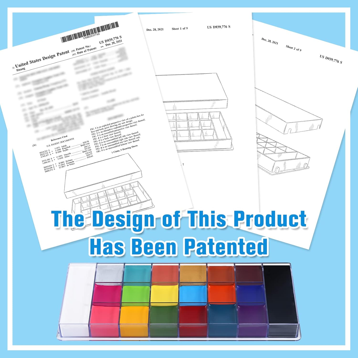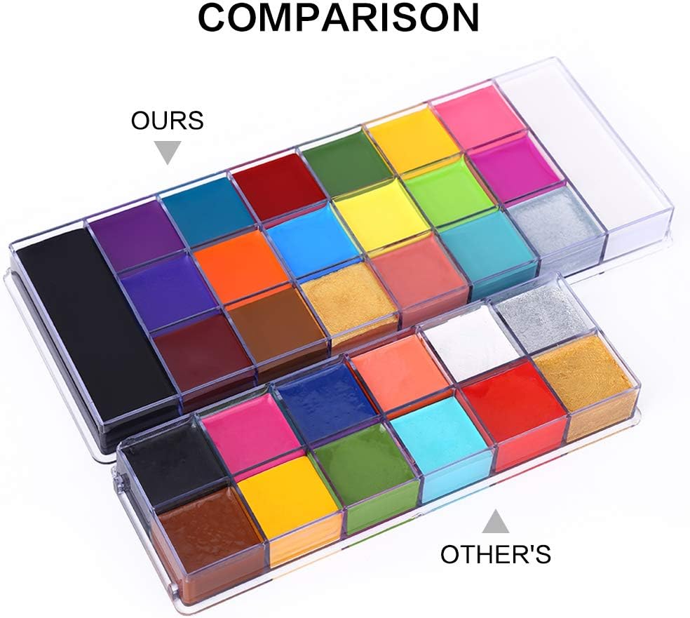 A LARGE SIZE Face Body Paint makeup palette refilled 20 creamy intensive pigmented colors in a convenient and sturdy plastic case that applies easily with sponge or brush. It worked on the face and body such flawlessly and easy to mix and layer.
